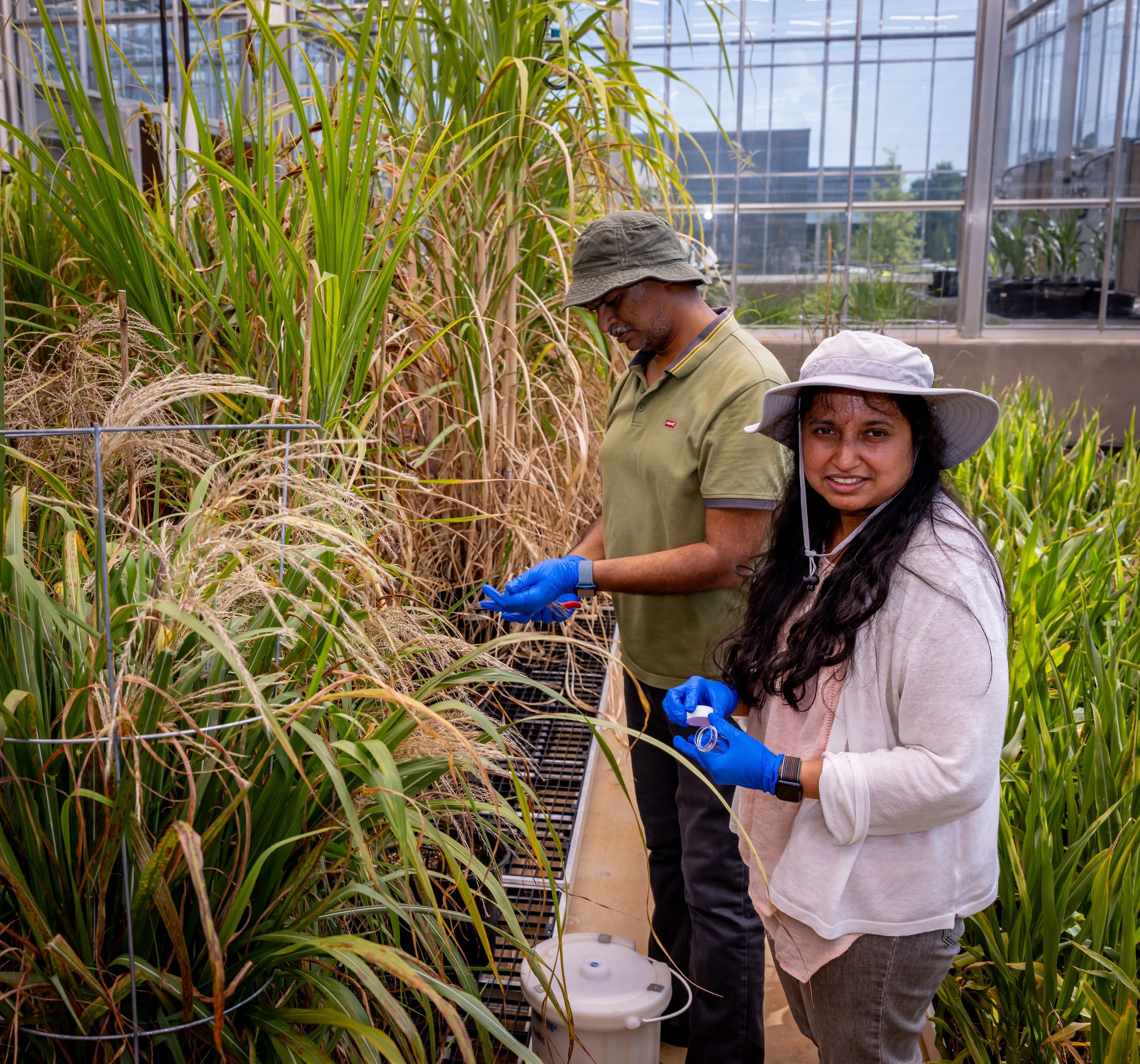 Shilpa Manjunatha and Pradeep Hirannaiah, PhD collecting samples from grasses in the greenhouse at HudsonAlpha