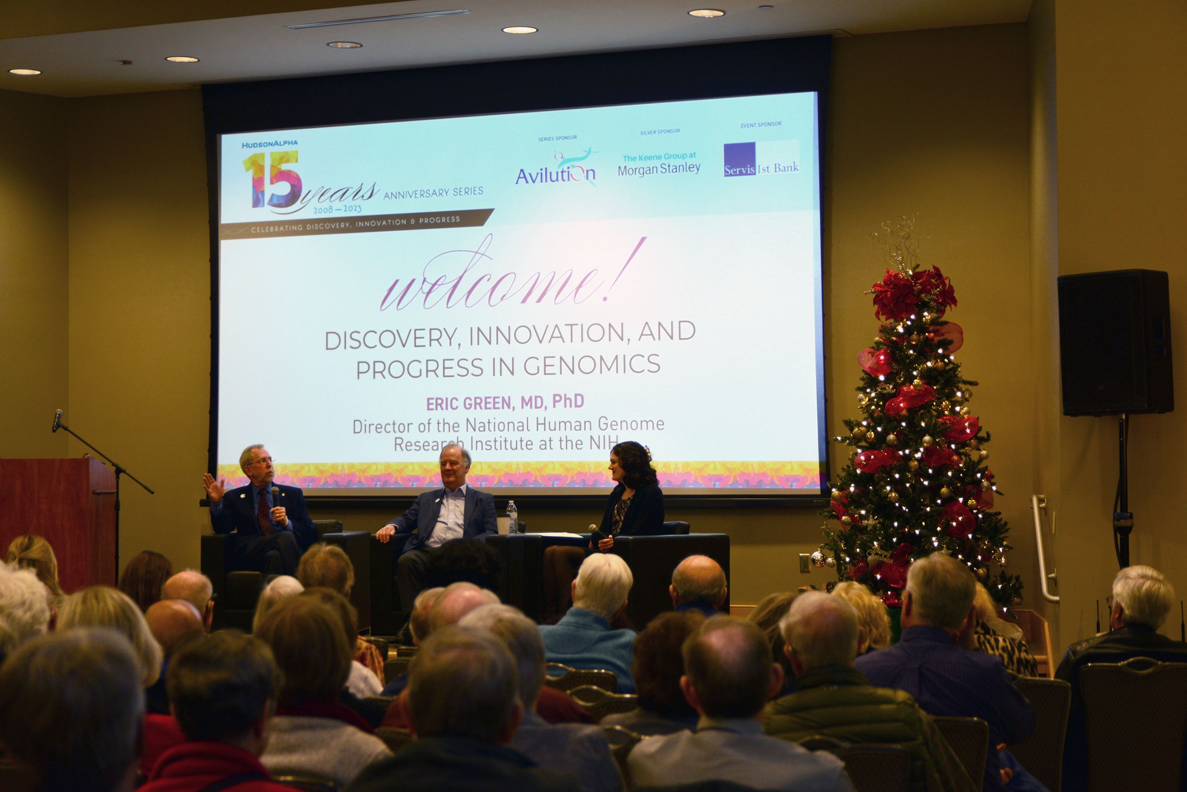 Drs. Eric Green, Rick Myers, and Sarah Sharman at Discovery, Innovation, and Progress in Genomics event